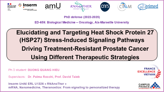First, I would send my best regards to my supervisors, who have provided me with the wonderful chance to be a student in their research team, Dr. Palma Rocchi and Professor David Taieb. Dear Palma, no words could express my gratitude to you because of the many wonderful things that I gained during my time as your student, from when I was an early bird in science working as a master-2 student in your lab until today, I have become mature and will soon be a scientist (oncologist). You are the one who gave me the wings to go far, with lots of patience and sympathy, and always supported and encouraged me to be brave to conquer my dreams. Working with you for my Ph.D, I had the first paper for my scientific career, a chance to travel to San Diego for a big cancer research conference, visiting the Vancouver Prostate Cancer Center, etc. There are so many good things that I have received, as I have always been well supported by you. I truly appreciate that you always tell me “because you deserved it”. You are the first supervisor who will be the special and unforgettable one to me. Dear David, thank you very much for your kind help and also for bringing me a lot of excellent ideas for the project. After we discuss, I always feel happy, and I know what I should do and am confident about myself. Thank you very much for always smiling, and I feel I am so lucky to be your student. To be honest, you and Palma are the best scientists that I have learned from my academic life, and looking at you, I found that I need to make a lot of effort to be a good scientist like you. To me, you are more than supervisors <3 (sending you hugs).
